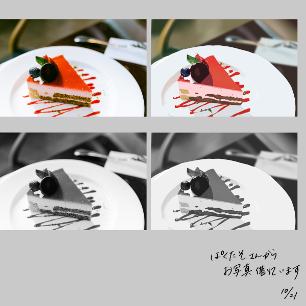 日記に綴ったあと、人と話す機会があったのでそれに関して意見を求めてみたところ、こういう雰囲気の作品のときはこういう塗り、って塗り分けをしてみてもいいんじゃないか?とアドバイスを貰いました。